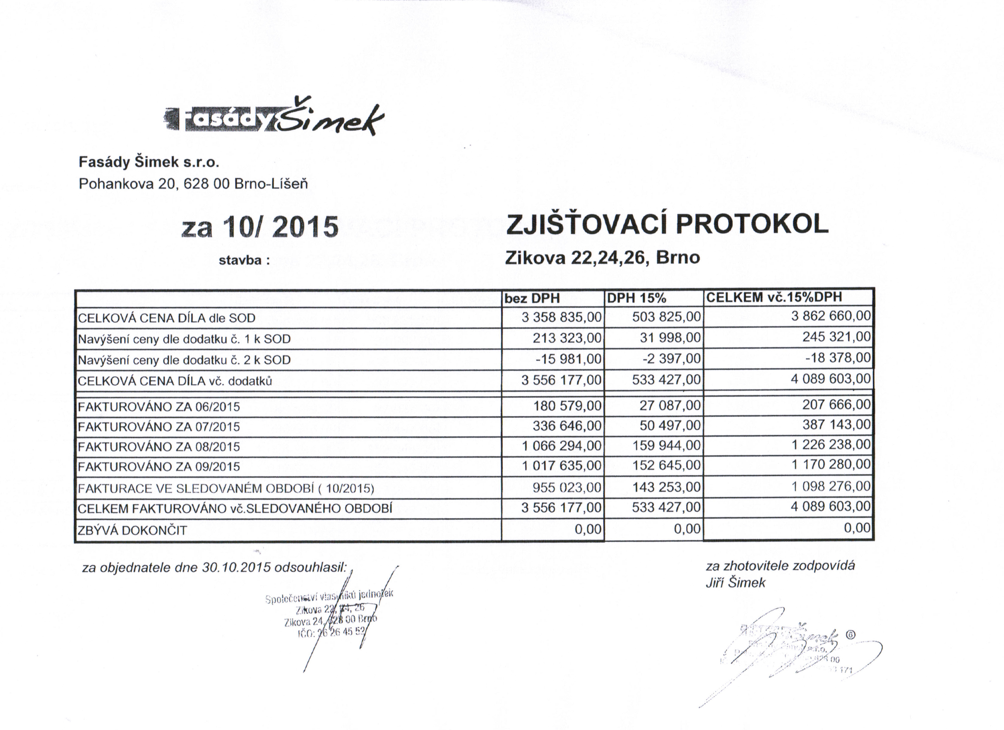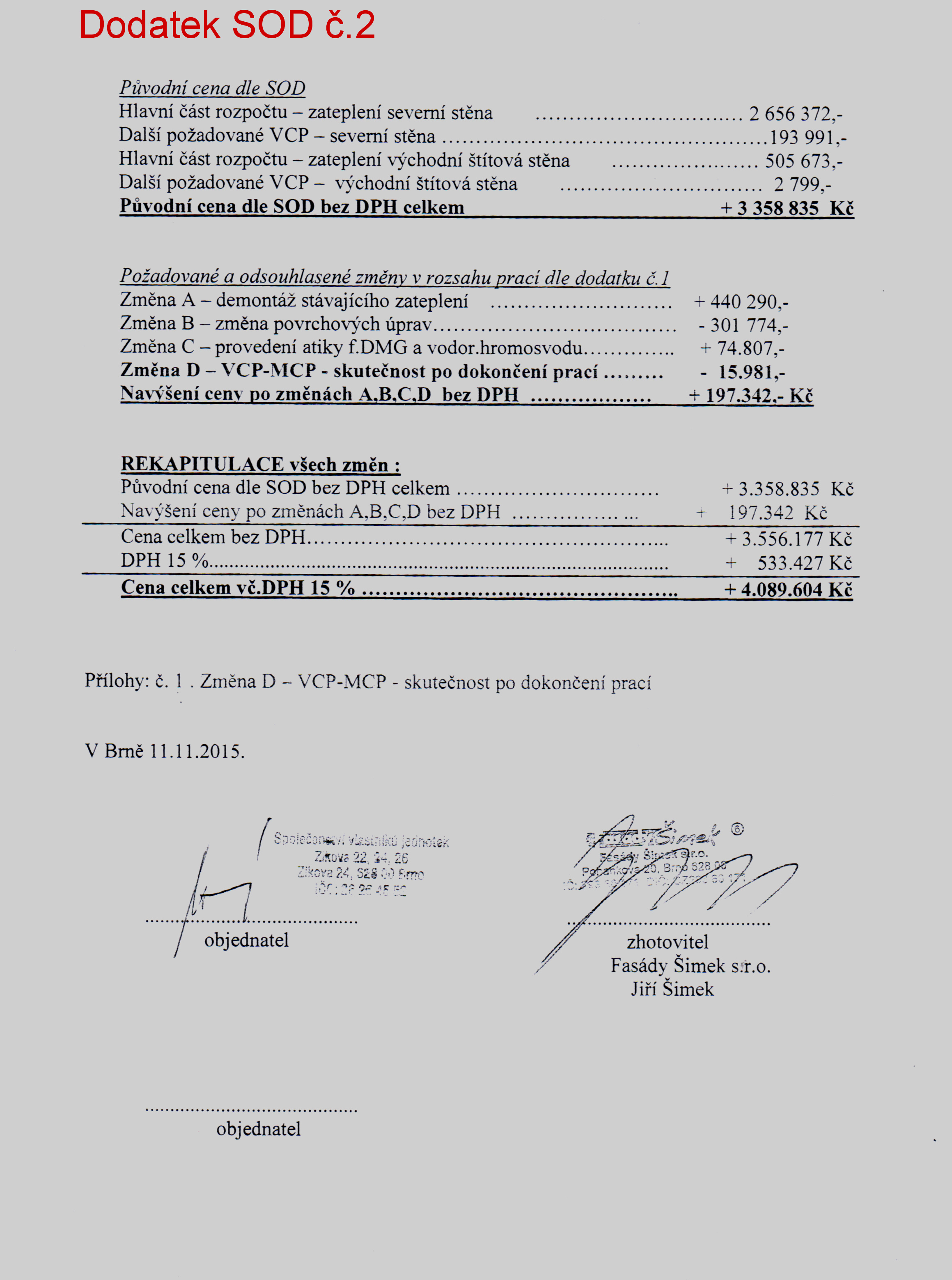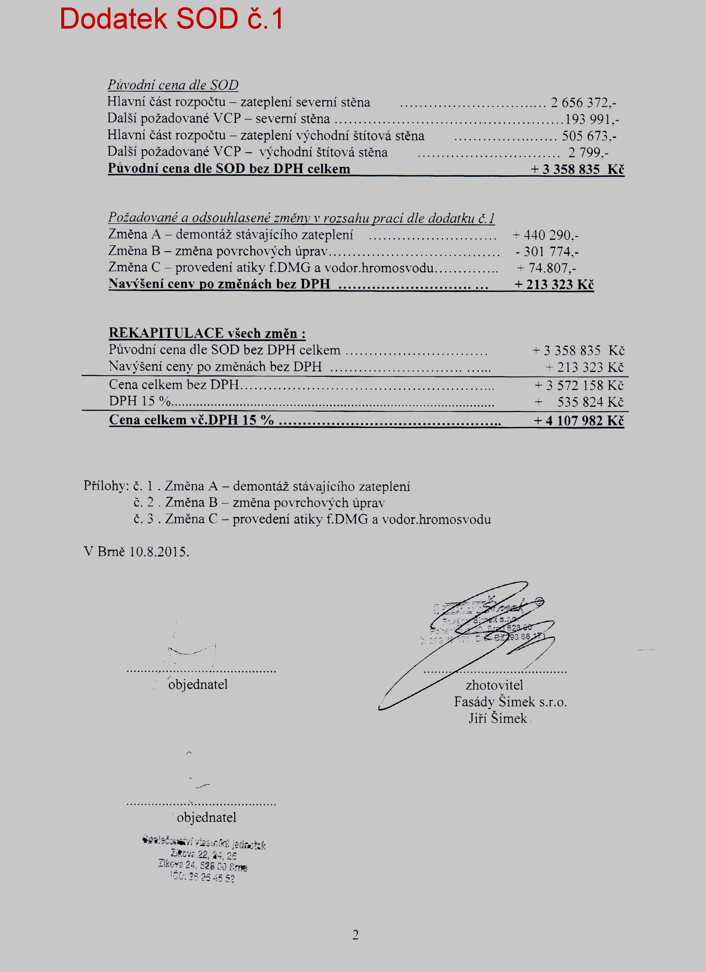 V příloze jsou tabulky cen provedených prací dle smlouvy a její dodatků 1 a 2 i provedené fakturace. Všechny faktury jsou uhrazené a od 25.1.2016, kdy je první splátka ve výši 56,377 CZK, začínáme splácet úvěr ve výši 4,000,000 CZK Komerční bance ...